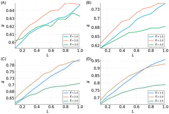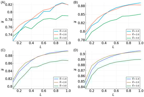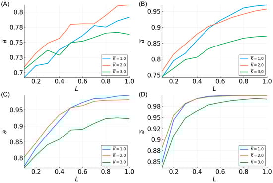 Mean accuracy, , vs.  for all of the recursive three-bit functions for different -valued reservoirs. Different sizes of reservoirs are shown:  = 10 (A);  = 50 (B);  = 100 (C) and  = 500 (D).