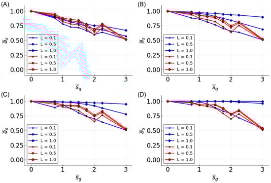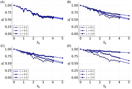 Mean accuracy, , vs.  for all of the three-bit functions for different -valued reservoirs. Different sizes of reservoirs are shown:  = 10 (A);  = 50 (B);  = 100 (C); and  = 500 (D).