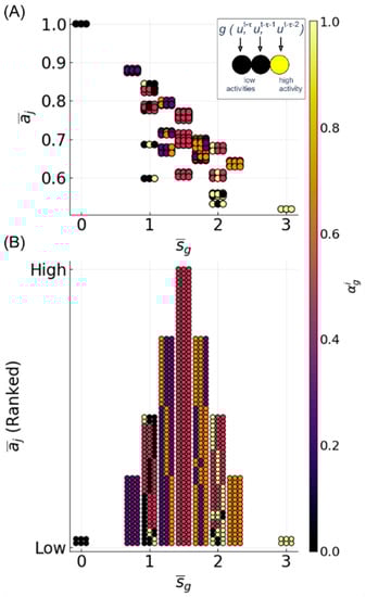 We examined the distribution of activities for three-bit functions, and found that the points of deviation (Figure 9) correspond to groups of functions with the same sensitivity, but different possible activities, e.g., ,  or , where  (Figure 11A). For such functions, reservoir accuracy generally decreases when the variables that are observed farthest in the past have higher activities. Notably, when  and/or  = 1 ( = 1,2), the function accuracy is significantly lower than that for other functions with the same  values. As a result, there are large dips in the mean accuracy at integer values of  (Figure 9). Thus, the performance of the reservoir is not only dependent on the sensitivity of the function, but also on the temporal distribution of activities (Figure 11B). For five-bit functions, the relationship between accuracy and activities is not as well defined, although it is still identifiable (data not shown).