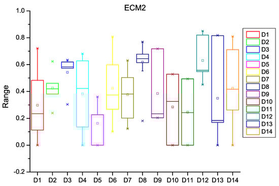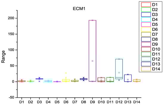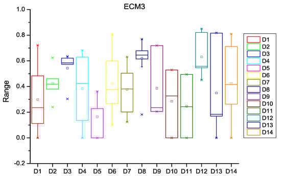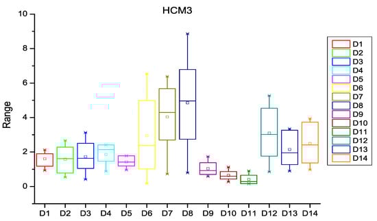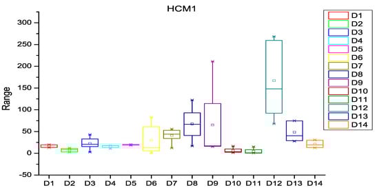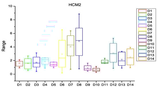 After extracting the number of changes per year in each file of the software subsystem, the probability of change was calculated for every file of the subsystem. HCM and ECM were then calculated using Equations (1)–(5), (8) and (9) as described in Section 3. Figure 3, Figure 4 and Figure 5 depict the box plots for HCM1, HCM2, and HCM3 metrics, respectively, for the 14 selected datasets. ECM1, ECM2, and ECM3 metrics for the 14 datasets are depicted in Figure 6, Figure 7 and Figure 8.