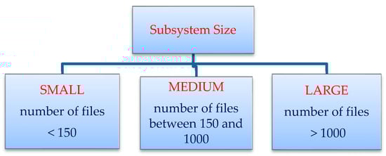 A software subsystem/system can be classified according to the number of files in the subsystem. A subsystem can be classified as small, medium, or large according to the criteria shown in Figure 9. A subsystem is considered small-sized if the number of files in the subsystem is less than 150. It is considered to be medium-sized if the number of files in the subsystem is between 150 and 1000. A subsystem is considered large if it contains more than 1000 files.