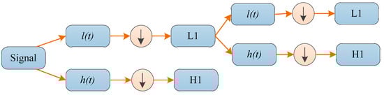 In (3), represent the coefficients of the approximation components, and represent the coefficients of detailed components. The functions represent the tap coefficients sequence of the low-pass filter, and represents the tap coefficients sequence of the high-pass filter. refers to the wavelet scale, and refers to the translation factors. DS operator represents the downsampling operation. The functions in (3) give the basis of the wavelet decomposition. This operation decomposes a signal into the detail components and the approximation coefficients . We call this process one-level decomposition.