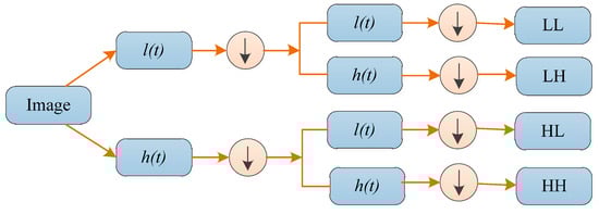 When DWT is used for two-dimensional (2D) images, it needs to be employed to each dimension separately. Figure 3 shows a one-level 2D DWT. The downward arrow denotes the DS operation. At each scale, there are four sub-band (LL, LH, HH, and HL) images: low frequency approximation LL, horizontal high frequency detail component HL, vertical high frequency detail component LH and diagonal high frequency detail component HH. These four sub-bands can each be regarded as an approximate component and a detailed component of the image. The sub-band LL is applied for the next 2D DWT. Then, the next layer of decomposition is performed on the low frequency subgraph obtained by the decomposition of the upper layer. Therefore, a simple layered framework of wavelets can be used to interpret image information.