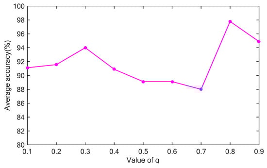 Because the brain is a sub-extensive system consisting of tissues and complex areas, the value of q should be smaller than 1. A key question is how to find the best value of q. The value of q is varied between 0.1 and 1, in increments of 0.1, and the average classification rate of 10 replicates is recorded on the test dataset (See Section 5.1). The result is shown in Figure 3. The average value of the classification rate fluctuates as q increased from 0.1 to 0.9. However, the average value of the classification rate reaches a peak at . The result in Figure 4 demonstrates that the value of q influences the classification performance. In this study, DNA-GA is used to search a good value of q. More details about the searching procedure are described in Section 4.