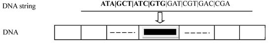 In general, the length of the DNA strand depends on the actual situation. If the length of the DNA strand is L, one strand contains N parameters. Then, the length of a DNA chromosome is . In this paper, we use to represent the mth chromosome in the population. Correspondingly, the fitness value defined in (11) of each chromosome is expressed as . Before calculating , is decoded to the value of the parameter it represents. Second, each chromosome contains the two parameters and in our algorithm. The symbols and can be used interchangeably.