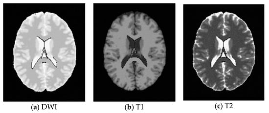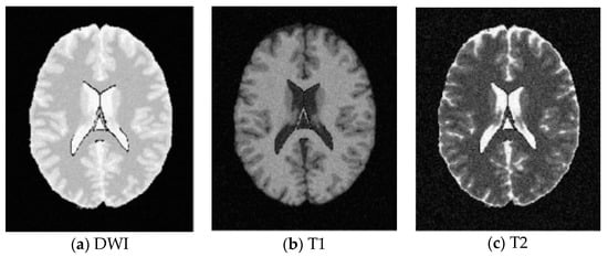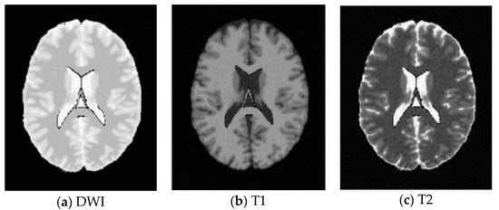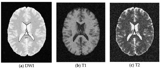 SBD: The database has DWI, T1 and T2 images of size 181 × 217 pixels. In our experiments, the classification results were quantified based on the ground truth of SBD. We added Rician noise to the analog image. In our experiments, the SNR (signal to noise ratio) values were set to 10 dB, 5 dB, 15 dB, and 20 dB, respectively. Shown in Figure 7, Figure 8, Figure 9 and Figure 10 are SBD images.