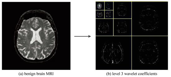 Human brain image segmentation, as a branch of medical image segmentation, can help us diagnose the diseases of the human brain. MRI images segmentation technology can help doctors diagnose patients with brain diseases such as brain tumors, cerebral infarction and Parkinson’s disease quickly and accurately. The use of brain imaging techniques to qualitatively and quantitatively analyze brain function is important for effective diagnosis of brain diseases. MRI imaging technology has a greater potential advantage than other imaging methods. MRI technology has more security than the other methods, because it does not have ionizing radiation. High quality MRI images have been routinely used for obtaining the anatomical and pathological conditions of the brain in both biomedical research and clinical diagnosis []. Since MRI is primarily used for soft tissue anatomy and can generate large amounts of detailed information about the brain conditions of a subject, the use of MRI images to classify normal and pathological brain conditions is very important in clinical diagnosis []. However, too much data makes manual interpretation difficult, so an automated image analysis tool needs to be developed. This study develops a new classification method, wavelet transform (WT), to realize the feature extraction and supporting vector machine (SVM) for classification. The classification method is applied to the classification of normal and pathological brain conditions. WT allows for the analysis of images at different resolution levels because they have multi-resolution analysis features. However, this technology requires a large amount of storage and is computationally intensive [].