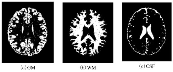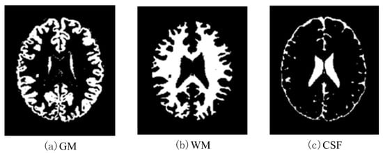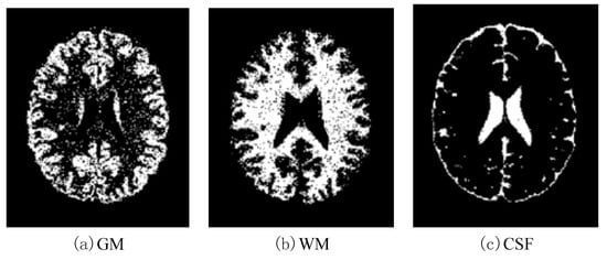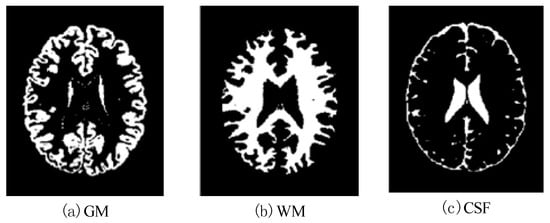 In this work, a DNA-GA optimized Tsallis [] entropy and kernel SVM have been implemented for the classification of brain tumors as benign or malignant, which is called DNAGA-TE+KSVM. The features used for this approach were the gray matter (GM), white matter (WM) and cerebral spinal fluid (CSF) probability map, which are shown in Figure 1. Adding the WM and CSF to the features can improve the results of the method of grouping voxels into ROIs by packaging labeled atlas. These features are extracted with the help of Discrete Wavelet Transforms (DWT) [] and Tsallis entropy. The DNA-GA algorithm is used to search a set of good parameter values in the Tsallis entropy and Gaussian radial basis function kernel. The algorithm in this paper can quickly get good parameter values and improve the classification performance of the SVM. The five-fold cross-validation is used to protect the classifier from overfitting. Once the features are extracted they are classified with the help of a trained SVM classifier.