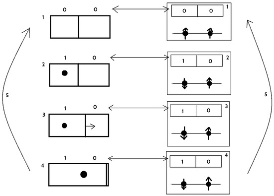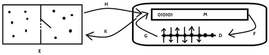 In the next part of our considerations this memory M is used as a Demon’s memory in the Maxwell’s demon “paradox”. In the experiment, there is the thermodynamic system, i.e., the box with an ideal gas, and the partition that can selectively be opened, i.e., part E. It is connected with the memory M, which saves informations on separation of gas particles depending of their kinetic energy, e.g., high kinetic energy particles are collected in the left and low energy particles in the right chamber. The functors and are relations between information on localization of the particle in E and its logical description in M (not in D). For details, consider Figure 2 where simplified Maxwell’s demon experiment (due to Leó Szilárd [26]) with one gas particle is presented. We describe every step in the cycle. Two-bit description of the logical state of the system was selected for better understanding—1 means that the particle is localized in the left (10) or the right (01) part of the box.
