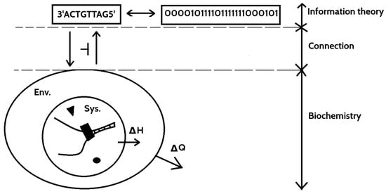 Schematic structure of computation in DNA. On the level of computation realm (information theory), there is information encoded in DNA strand. It is Galois connected with biochemical system which realizes computations by means of chemical reactions. This system contains an Environment (Env.) and embeds inside the System (Sys.) with DNA, chemical elements and enzymes, where actual computation takes place. The Environment interacts with the System for conducting specific chemical reactions that realizes logical operations. The System and Environment overall fulfill the second law of thermodynamics and therefore the total entropy can remain constant or increase, i.e., . Defining the enthalpy change (dispersed heat of the System) as and the Gibbs free energy change as on gets the famous equation . All reactions in the system are spontaneous if , that is . This is the principle of interaction between the System and the Environment.