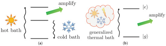 A quantum engine converting energy into the amplification of a light field. (a) in the original formulation, the engine draws heat from a hot bath, emits into the light field and rejects extra heat into a cold bath, satisfying Carnot’s principle; (b) coupling the transition of interest to a generalized thermal bath, we aim for the engine to extract work from a single resource.