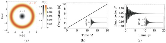 Now that the machine is assembled, we first test numerically [21] whether light amplification takes place at all by initializing to the ground state with an empty cavity and letting the engine run according to the master equation on the left of Equation (2). In Figure 3a, the phase space distribution of the light field is shown employing the Husimi Q representation , where is obtained by tracing out the working medium and is a coherent state of amplitude . The ring obtained from the initial centered vacuum state is a conclusive signature of the desired amplification, corresponding to the state being displaced in phase space. As the energy is extracted from a generalized thermal bath, the system does not possess any phase reference and the resulting light field is thus rotationally symmetric. The statistics of the light field is further characterized in (b) and (c), where the occupation is found to increase linearly in time with a Fano factor reaching unity, yielding the Poissonian statistics of a coherent state.