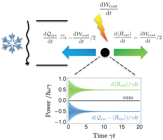 which completes the thermodynamics analysis of the engine. As illustrated in Figure 4, half of the work investment indeed flows to the qubit, and is entirely rejected as wasted heat once the system operates in the steady-state regime.