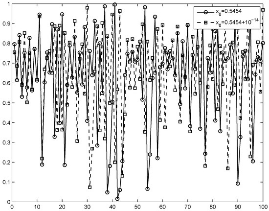Cryptology can be utilized to develop methods for secure transmission of images. However, images are different from text files, and have many unique characteristics, such as bulk data capacity, high redundancy, and strong inter-pixel correlation. As a result, traditional encryption algorithms such as DES, AES, and IDEA are not suitable for secure encoding of images. Development of algorithms for effective image encryption remains an important priority in the fields of computer science and communications. Recently, chaos-based image encryption schemes have received considerable attention; these methods allow for hiding image-related information accounting for the desirable properties [1,2] of extreme sensitivity to initial conditions, ergodicity, and pseudo-randomness of chaos systems (maps). As early as 1998, Fridrich [3] proposed an image encryption method that used a two-dimensional chaotic map. In what follows, many encryption algorithms have been designed, which fully or partially utilize the Fridrich structure (i.e., permutation–diffusion). For example, a bit-level image encryption algorithm [4] was proposed based on piecewise linear chaotic maps, in which a diffusion strategy was introduced followed by a permutation of bits for each value. Quantum chaotic map [5] with a diffusion-permutation architecture-based image encryption algorithm has been presented. Norouzi et al. designed diffusion-only image encryption schemes [6,7]. The test results show high sensitivity and high complexity. The behavior of quantum walks was proved [8] to be chaotic, and a permutation-based image encryption algorithm has been proposed. It calculates the sum of the plain-image and uses the resulting value to diffuse the image’s pixels. Furthermore, to enhance the sensitivity of the encryption method, a quantum hash function is taken to act as a hash function for the privacy amplification process [9]. Exclusive OR (XOR) as a diffusion operation and shuffling as a permutation are then applied to the plain-image and yield a cipher-image with a new encryption structure. A unique and more distinctive encryption algorithm is proposed based on the complexity of a highly nonlinear S box in Flesnelet domain [10]. DNA-based image encryption methods [11,12,13] and other similar architectures [14,15,16,17,18,19,20,21,22] have also been presented as encryption techniques to ensure communication of images.