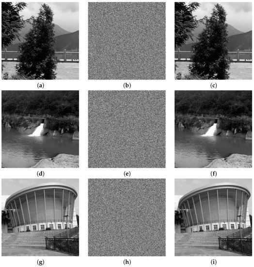 Experimental tests: (a) plain-image of Tree; (b) cipher-image of Tree; (c) decrypted image of Tree; (d) plain-image of Lake; (e) cipher-image of Lake; (f) decrypted image of Lake; (g) plain-image of Building; (h) cipher-image of Building; (i) decrypted image of Building.
