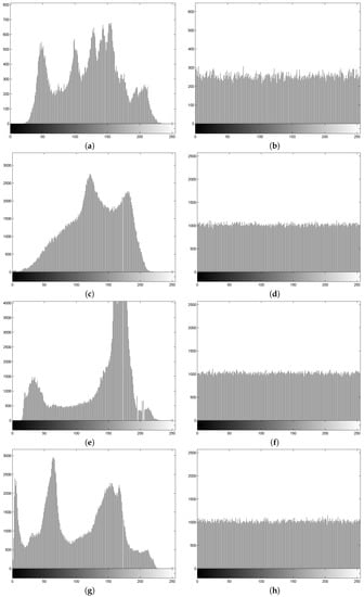 Histograms of: (a) the plain-image of Lena; (b) the cipher-image of Lena; (c) the plain-image of Baboon; (d) the cipher-image of Baboon; (e) the plain-image of Boat; (f) the cipher-image of Boat; (g) the plain-image of Peppers; (h) the cipher-image of Peppers.