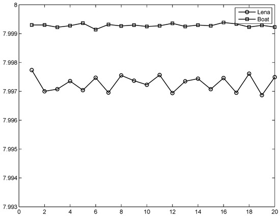 where is the total number of states of the tested message ( for a gray level image). Here, we tested four images, and the results are listed in Table 1 (using code “entropy” in Matlab). We conclude that the information entropy indicates that it is difficult to conduct a successful attack because the values of the information entropy for the cipher-images are close to a theoretical value of 8 [35,36]. The random numbers inserted into the image in each encryption, so the values of the information entropy would be changed very slightly each time. Figure 4 shows the results for encrypting Lena and Boat at different times.