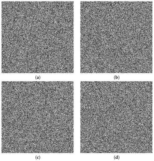 A good image encryption algorithm should be very sensitive to all of the keys used. We tested our algorithm on the image of Lena, and the results are listed in Figure 5. Figure 5a–d shows the incorrect decryption from the cipher-image with a small change (i.e., ) added in keys , , , and , respectively. Therefore, the proposed image encryption algorithm possesses a high key sensitivity and can frustrate brute-force attackers.