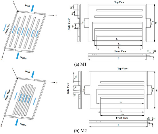 Six different heat sink configurations (M1 to M6) with dimensions L × W × H and are depicted in Figure 1. Three configurations (M1 to M3) are without baffles and the other configuration are fitted with different baffles (M4 to M6). All the channels and baffles are arranged symmetrically. As shown in the front view of the models, H1 is the depth of the counter sink. These configurations are chosen to see the effect of having baffles on the flow and temperature distribution.