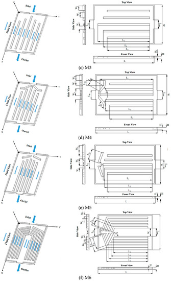As shown in Figure 1a, M1 has five parallel channels of the same width, and the length of the channel at the inlet, excluding the middle channel, is cut down according to the angle between the cut direction and the main flow direction that is 15°.