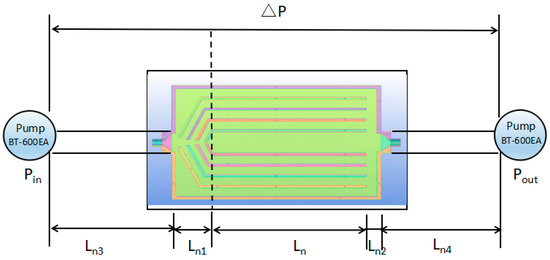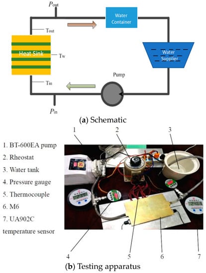 Figure 2a shows the schematic of the experimental setup used to test the heat-transfer performance of the MBHS. An annotated picture of the experimental apparatus is shown in Figure 2b. Figure 3a shows the top view of the heat sink and Figure 3b shows a drawing of the channel with the locations of the inlet and outlet. Water is selected as the coolant, which is pumped into the channels using a peristaltic pump BT-600EA. When the temperature of the water decreases to the entrance temperature of 293 K, the coolant is flushed into the water container. The inlet and outlet pressures (Pin and Pout) are measured using HG-80K intelligent digital pressure gauges that measures pressures ranging from 0 to 1MPa. The relative accuracy is ±2%. The pressure drop of the MBHS ΔP is equal to as shown in Figure 4. The pressure drop between the inlet and outlet, ΔP can be expressed as