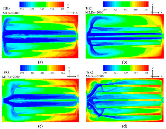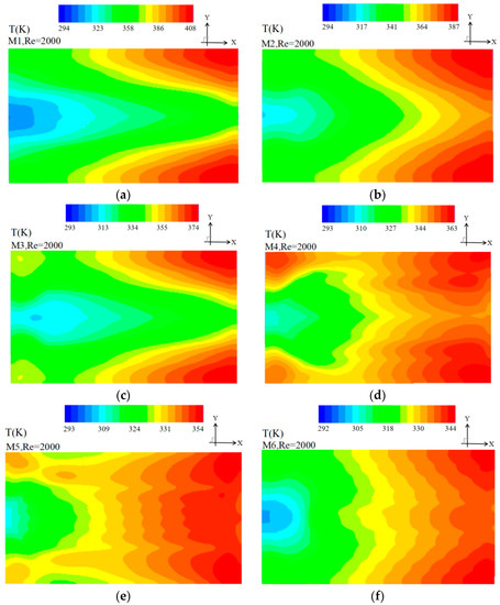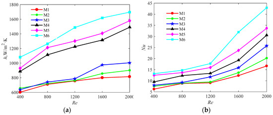 Table 4 also shows the comparison of the experimental and numerical results of the heat-transfer coefficient and pressure drop under five different velocities. Comparing the experimental results and the computational results verifies the reliability of using the simulation results to develop a design scheme. Knowing this, the important heat-transfer factors are compared for all six models.