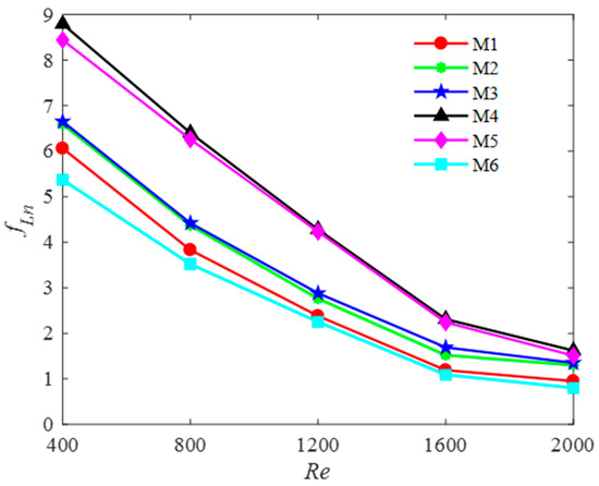 Table 3 shows the pressure drop plots from the simulation and the experiments. There is a strong agreement between the plots showing the simulation results well predicts the experimental data with Re = 2000 The pressure drop measured in the experiments is slightly larger than that of the simulation results with a less than 2.8% deviation. The maximum error in the pressure drop between the simulation and experiment is 3.6% where the Reynolds number is 800. A comparative analysis of the friction factor between the experiment and numerical simulation is calculated by Equation (6). For a given Reynolds number, the maximum error of the friction factor between the simulation and experimental values is 4.3%.