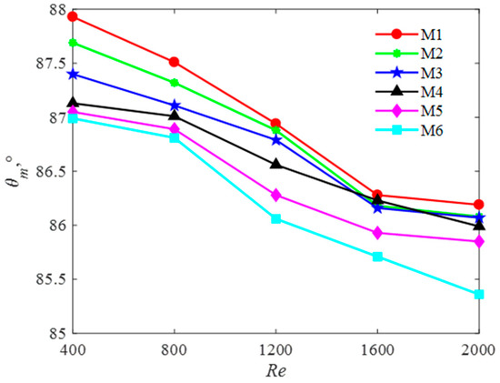 Following the discussion on the velocity, pressure, temperature, and the synergy angle distribution for the models, the simulation and experimental results are compared for the convective heat-transfer coefficient and Nusselt number. Table 4 shows the heat-transfer coefficient for M6 calculated from the exoperimantal data using Equation (18) and from the numerical results. It is observed that the results obtained from the simulation well predicts the experimental results. The obtained maximum discrepancy between the heat-transfer coefficients of the simulation and experiment is 6.4% for Re = 2000. Table 4 compares the results for Nusselt number obtained from the simulation and experimental results. The maximum discrepancy in the Nusselt number between the simulation and experimental values is 4.7% observed for Re = 2000. This indicates that the simulation results agree well with those of the experiment.