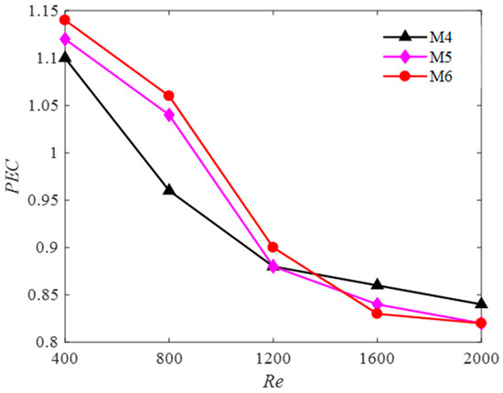 Figure 15 represents the influence of different models on the over all heat-transfer performance of the heat sink for various Reynolds numbers. It can be seen apparently that the PEC for M6 has a best performance in low Reynolds number range, and the value of the PEC is larger than 1. The PEC values for M4 are higher than other models in the high Reynolds number range, however, it remains less than 1 for the high Reynolds number range considered. Above all, M6 is suggested as the best type of heat sink.