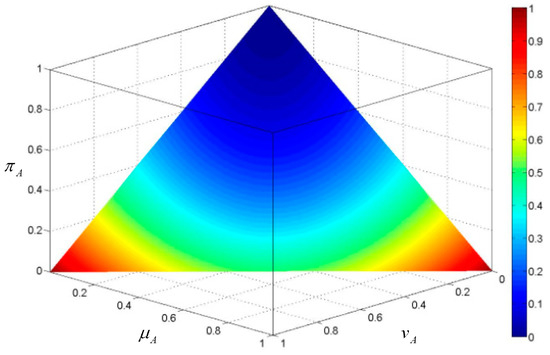 To provide a visual perception on the proposed knowledge measure, we consider an AIFS A defined in X = {x}. Based on the geometric interpretation of AIFSs proposed by Szmidt and Kacprzyk [28], the values of the knowledge amount are projected to the hyper plane in the unit intuitionistic fuzzy cube, as shown in Figure 1. The change of knowledge amount according to the distribution of membership and non-membership grades can be reflected by this figure. We note that, in the condition of , the knowledge amount is decreasing with the hesitancy degree. For a fixed hesitancy degree, the knowledge amount is increasing the difference between the membership degree and the non-membership degree. This is consistent with the proposed axiomatic properties of the knowledge measure.