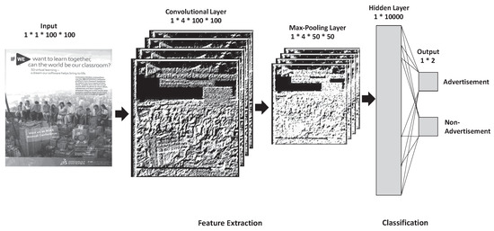 In this study, we employed convolutional neural networks to detect advertisements within scanned images from magazines. Figure 1 shows several sample images of both advertisements and non-advertisements. As you can see, there are no clear visual features to classify them, e.g., colors or shape. In order to address this, the proposed architecture consists of three layers: the convolutional layer, max-pooling layer, and fully connected layer (hidden and output layers). The architecture is illustrated in Figure 2. Our approach follows two steps: