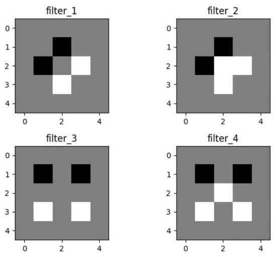 We used four filters in the convolution layer for detecting the low-level features, which, in this case, are the edges. Four filters with a size of 5 × 5 were created without depth because the input image is in grayscale and has no depth. One filter detects horizontal edges, one detects vertical edges, and the remaining two filters detect diagonal edges in the input image during the convolution process. Figure 4 shows the edge detection filters used in our model for the convolution process. The filters in the diagram are the basic edge detector filters. These filters detect the horizontal and vertical edges.