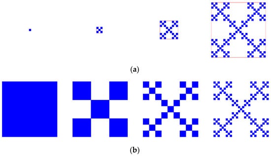 A regular growing monofractal that bears an analogy with urban growth. (a) Monofractal growth; (b) Monofractal generation. Note: A monofractal possesses only one scaling process, and is also termed “unifractal” in literature. Figure 1a represents the variable scale of measurement based on the variable size of the study area, and Figure 1b represents the variable scale of measurement based on a fixed size of the study area.
