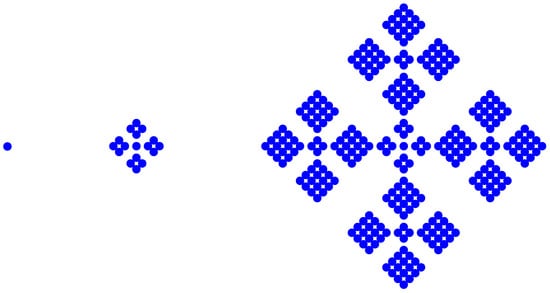 The spatial structure of multifractal systems differs from that of simple fractal systems. For the multifractal systems, entropy values depend on the size and location of the study area, as well as on the scale of measurement. Let’s see an example of the spatial heterogeneity and entropy conservation of multifractals. The following regular growing multifractals are well known for many fractal scientists and some urban geographers (Figure 2). The first step is special, and the results are outliers, too. The entropy value depends on the linear size, but the box fractal dimension value is certain. From the second step onwards, the entropy values and fractal dimensions are listed as below: