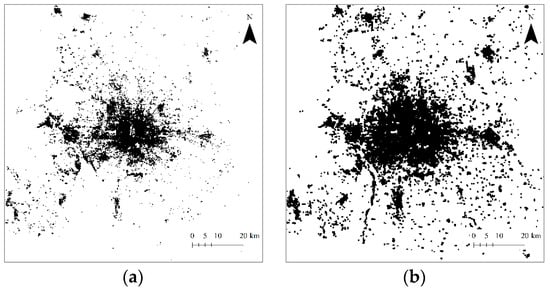 - Step 1: Defining an urban boundary based on the recent image. The most recent material we used was the remote sensing image of 2015. Based on this image, the boundary of Beijing city can be identified by using the “City Clustering Algorithm” (CCA) developed by Rozenfeld et al. [,]. The urban boundary can be called an urban envelope [,]. Then, a measure area can be determined in terms of the urban envelope [].