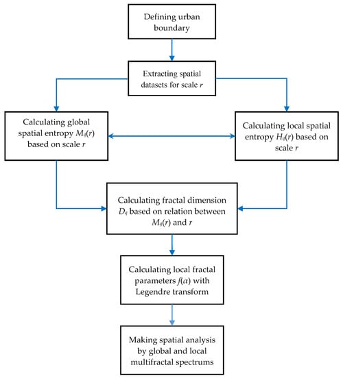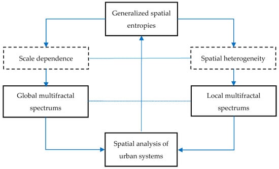 Figure 4. A flow chart of spatial analysis for cities from spatial entropy to multifractal spectrums. Note: Spatial entropy can be used to make spatial analysis of cities based on characteristic scales, while multifractal spectrums can be employed to make spatial analysis based on scaling in cities.