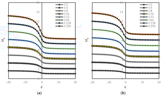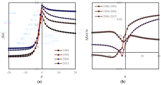 where Pi is the growth probability of the ith fractal unit, ri is the linear size of the ith fractal unit, q denotes the order of moment, and the exponent Dq represents the generalized correlation dimension []. For a monofractal, i.e., a simple self-similar fractal, we have, Dq ≡ D0; for a self-affine fractal, different directions have different fractal dimension values, and for a given direction, we have Dq ≡ D0. However, a multifractal system is more complex. Different parts of a multifractal system have different characters, and can be described with different fractal dimension values. To simplify the process of spatial measurement, the varied linear scales ri can be substituted with a unified scale r. For example, based on the box-counting method, the unified scale, r, can be represented by the linear sizes of boxes. Thus, Equation (5) can be re-written as [,]: