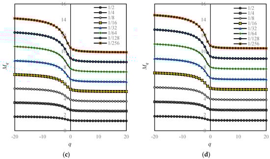 The Renyi entropy spectrums based on moment order parameter and different spatial scales of measurement. Note: From the bottom to the top, the linear size of functional boxes are r = 1/2, 1/4, 1/8, 1/16, 1/32, 1/64, 1/128, and 1/256, respectively. Different linear sizes of the boxes represent different spatial scales of measurements, and different Renyi entropy spectral lines based on different box sizes reflect the scale-dependence of spatial entropy. (a) 1984; (b) 1994; (c) 2006; and (d) 2015.
