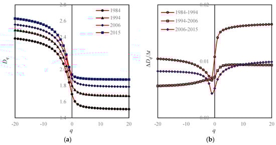 The global multifractal spectrums based on moment order parameter and change curves of global dimensions. Note: Based on different linear sizes of functional boxes, i.e., r=1/2, 1/4, 1/8, 1/16, 1/32, 1/64, 1/128, and 1/256, and the corresponding Renyi entropy Mq(r) values, the generalized correlation dimension Dq can be evaluated. Multifractal parameter values depend on moment order q, but are independent of spatial scale r. (a) Global multifractal dimension spectrums; (b) Global fractal dimension changes.