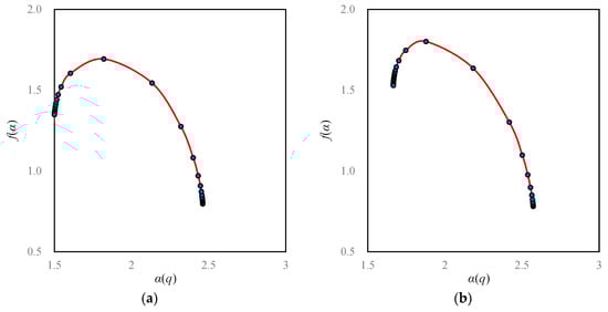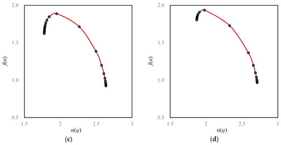 If we convert the Renyi’s entropy values into multifractal parameters, the value of a parameter is unique. For the moment order q = 0, we can transform a series of Boltzmann macrostate entropy M0(r) values into a capacity dimension D0 value; For q = 1, we can transform a series of Shannon information entropy M1(r) values into an information dimension D1 value; for q = 2, we can transform a series of Renyi correlation entropy M2(r) values into a correlation dimension D2 value. For an arbitrary order of moment q, we can transform Renyi’s generalized entropy Mq(r) values into a set of generalized correlation dimension Dq values. Apparently, for a given order of moment, say, q = 1, the fractal dimension D1 value is independent of the linear sizes of boxes r (Figure 6). Using Equation (3), we can convert the generalized correlation dimension Dq values into the mass exponent τq values. As indicated above, the generalized correlation dimension Dq and mass exponent τq belong to the global parameters of multifractal models. By means of Legendre transform, Equations (11) and (12), we can transform the global parameters into local parameters, including the singularity exponent α(q) and the corresponding fractal dimension f(α(q)) (Table 4). Based on the global parameters, we have the global multifractal spectrum, i.e., Dq-q spectrums (Figure 6); based on the local parameters, we have the local multifractal curves (Figure 7), and f(α)−α spectrums (Figure 8). The local spectrum is often termed an f(α) curve in the literature []. In practice, we can compute the local parameter values by using the normalized measure method first [,]. Then, using Legendre transform, we can convert the local parameter values into the global parameter values [,,].