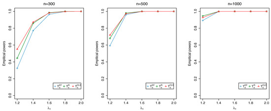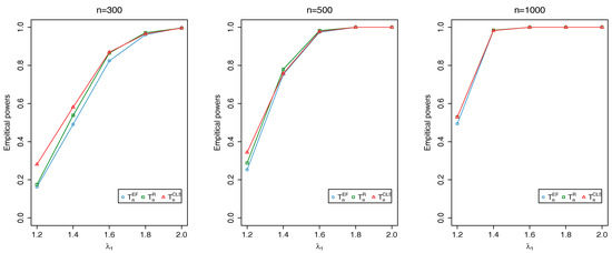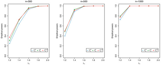 Plots of empirical powers of , and at nominal level 0.05 when changes to and changes to .