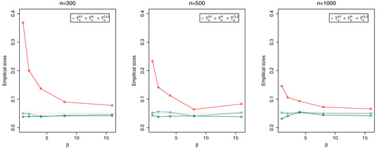 Plots of empirical sizes of , and at nominal level 0.05.
