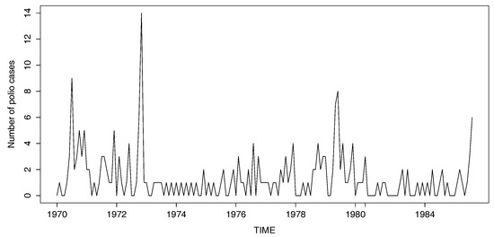 - Kang, J.; Lee, S. Parameter change test for random coefficient integer-valued autoregressive processes with application to polio data analysis. J. Time Ser. Anal. 2009, 30, 239–258. [Google Scholar] [CrossRef]