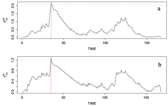 In order to test for a change in , and are performed at the nominal level 0.1; the corresponding critical values are 2.054 and 1.212, respectively (cf. the horizontal lines in Figure 6). As a result, we obtain = 2.166 and indicating rejection of the null hypothesis. Since both and have a maximum at (cf. Figure 6), the location of the change can be estimated as November 1972. It is the same result as those of Kang and Lee [5,9].