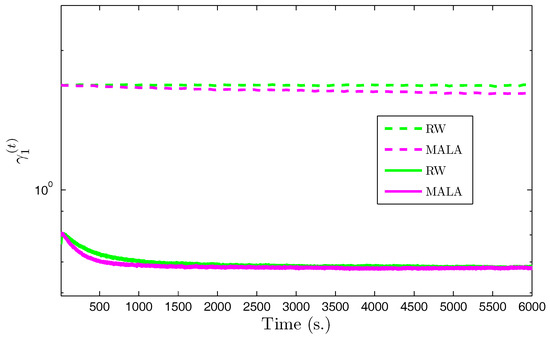 Non-Gaussian models arise in numerous applications in inverse problems [34,35,36,37]. In this context, the posterior distribution is non-Gaussian and does not generally follow a standard probability model. In this respect, MH algorithms are good tools for exploring such posteriors, and hence for drawing inferences about models and parameters. However, the challenge for MH algorithms is constructing a proposal density that provides a good approximation of the target density while being inexpensive to manipulate. Typically, in large-scale problems, the proposal distribution takes the form of a random walk (RW); that is, in each iteration, the proposal density in (3) is a Gaussian law centered at the current state and with covariance matrix . Moreover, is a positive constant whose value is adjusted so that the acceptance probability in (3) is bounded away from zero at convergence [17]. Other sampling algorithms incorporate information about the derivative of the logarithm of the target distribution to guide the Markov chain toward the target space where samples should be mostly concentrated. For instance, when the target density is differentiable, one can use Langevin-based algorithms where the mean of the Gaussian proposal density is replaced with one iteration of a preconditioned gradient descent algorithm as follows [20,22,38,39,40,41]: