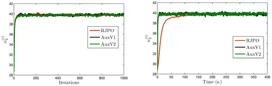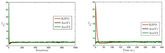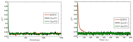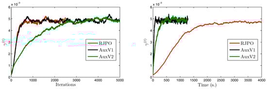 Note that maximizing the mean square jump is equivalent to minimizing a weighted sum of the 1-lag autocorrelations. In Table 5, we show estimates of the mean square jump per second in stationary state, which is defined as the ratio of the mean square jump and the computational time per iteration. This can be seen as an estimation of the average speed of the algorithm for exploring the parameter space at convergence. We also compared the statistical efficiency of the different samplers with respect to RJPO, defined as the mean square jump per second of each sampler over the mean square jump per second of RJPO. We can notice that the speed improvement of the proposed algorithms came at the expense of a deterioration of the quality of the generated samples. In fact, both proposed algorithms yielded lower values of mean square jump than the RJPO algorithm, which indicates that correlation between successive samples was increased. Furthermore, AuxV1 appeared to have better mixing properties compared with AuxV2. However, the generation of every sample in RJPO is very costly, so its efficiency remained globally poorer compared with AuxV1 and AuxV2. The best trade-off between convergence speed and mixing properties of the chain was achieved by the proposed AuxV1 algorithm.
