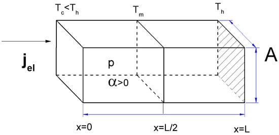 In the framework of linear Onsager theory, the mutual interference of heat and electrical current flow in the thermoelectric process is considered in terms of the kinetic coefficients, which obey the Onsager reciprocity relations [,], and the related transport coefficients, such as the electrical conductivity (), thermal conductivity () and Seebeck coefficient (). Under isotropic conditions, a thermoelectric material is commonly considered based on linear constitutive equations for the electrical current density () and heat flux (). It is well known that the spatial distribution of Peltier heat may exhibit singularities at the junctions of two different materials, which is of interest in this analysis because we consider a segmented p-type leg based on two different materials. Assuming steady-state conditions, the principles of the conservation of charge and energy lead to the following 1D governing differential equation [,]: