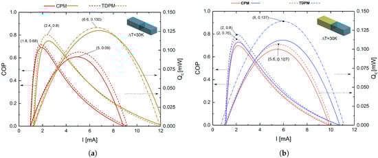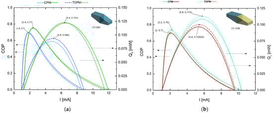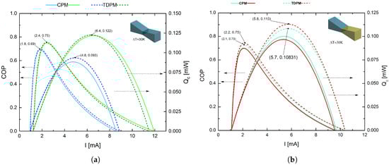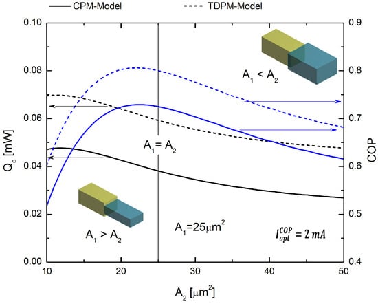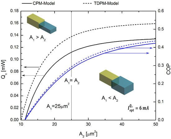 Figure 9, calculated using an electrical current of mA, which optimizes obtained in Section 4.1.1 (see Figure 4b), shows the and for the same values of as used in the above analysis, for the cases when and . The maximum value of was obtained for the TDPM model, but this led to lower values of , as seen in Figure 9, with a maximum value of mW for = 10 m, and after this point, decreased. The maximum cooling rate occurs at a certain value of = 21.4 m for the TDPM model, and the rate of cooling is lower when the area increases. The maximum value occurs for the lower area value of = 10 m, and then, the COP decreases for higher values of .