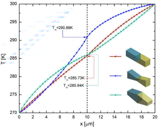 In this section, the spatial temperature distribution along the segmented element is analyzed for the TDPM models. A temperature difference of T = 30 K was used for all of the geometric models of the segmented p-type legs considered in this study. The temperature distribution was evaluated when the temperature in the segments had reached a steady-state distribution. Figure 7 shows the spatial temperature distributions for the hybrid systems discussed in the previous section. It is readily apparent that the three systems exhibited very distinct temperature distributions. As discussed above, the highest performance observed in this study was obtained for the inverse hybrid system with rectangular prism geometry. A comparison of the temperature distributions along the three lines revealed that the average temperature in the junction ( K) was lower for this system compared with the two trapezoidal prism hybrid systems. In fact, it has been shown that lower values of temperature in the thermocouple act to improve the cooling power, as shown in Figure 7 (red line). It should be noted that the heat absorbed in the first segment is due to , and the heat released in the second segment is due to . Compared with the rectangular model, the trapezoidal leg model exhibited two additional features. Firstly, the trapezoidal cross-sectional area produces an asymmetric thermal resistance, and therefore, Joule heat is preferentially conducted toward the larger cross-sectional area. Consequently, for the trapezoidal prism system with small junction contact area, a lower temperature was observed in the first segment and a higher temperature in the second segment, leading to a higher . The opposite was observed for the trapezoidal prism system with a large junction contact area, leading to a lower . Secondly, a greater amount of Joule heat is produced in the leg where the cross-sectional area is smaller.