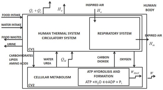 According to Mady and Oliveira Junior [], the human body may be simplified as two control volumes, indicated in Figure 1 by CV1 and CV2. The first one represents the thermal system and respiratory system and the second the cellular metabolism. The figure indicates the heat transfer rates associated with convection, , and radiation, , and an enthalpy associated with vaporization (including water leaving the body by diffusion and sweat), . There is also an enthalpy variation due to respiration . The sum of these quantities is the energy transfer to the environment (). Each stream leaving the control volume has its own associated exergy; hence, . The term is the heat rate released to the body caused by cellular metabolism and will be further analyzed.
